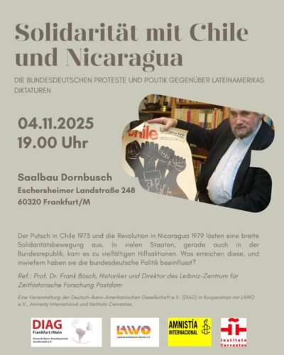 Karte des Veranstaltungsorts Termine an diesem Ort Solidarität mit Chile und Nicaragua Datum4. November 2025 19:00 – 21:00 Uhr Saalbau Dornbusch